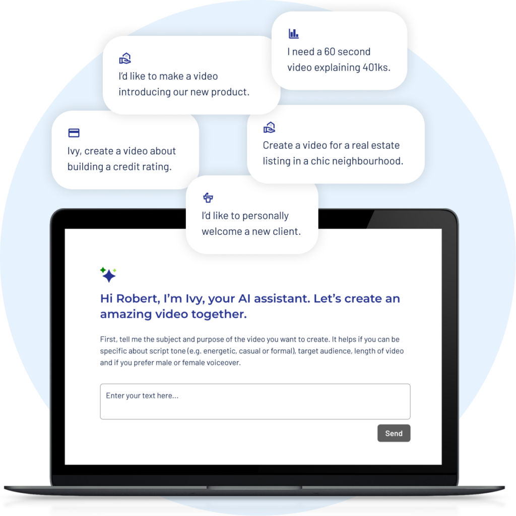Let Ivy, our AI assistant, help you build a personalized video in less than 90 seconds from text to video in a flash.